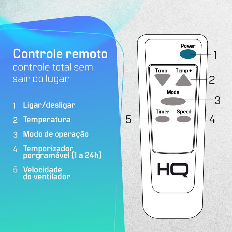 O ar-condicionado portáteis HQ é a solução perfeita para conforto e praticidade. Disponíveis em modelos de 8.500 BTUs e 10.500 BTUs, são ideais para ambientes de até 15m². Com design moderno, oferecem modos de resfriamento, ventilação e desumidificação, além de função Sleep e temporizador de 24 horas. Utilizam gás refrigerante R32, que reduz impactos ambientais, garantindo eficiência e sustentabilidade. Compactos, fáceis de instalar e transportar, proporcionam bem-estar em qualquer lugar.