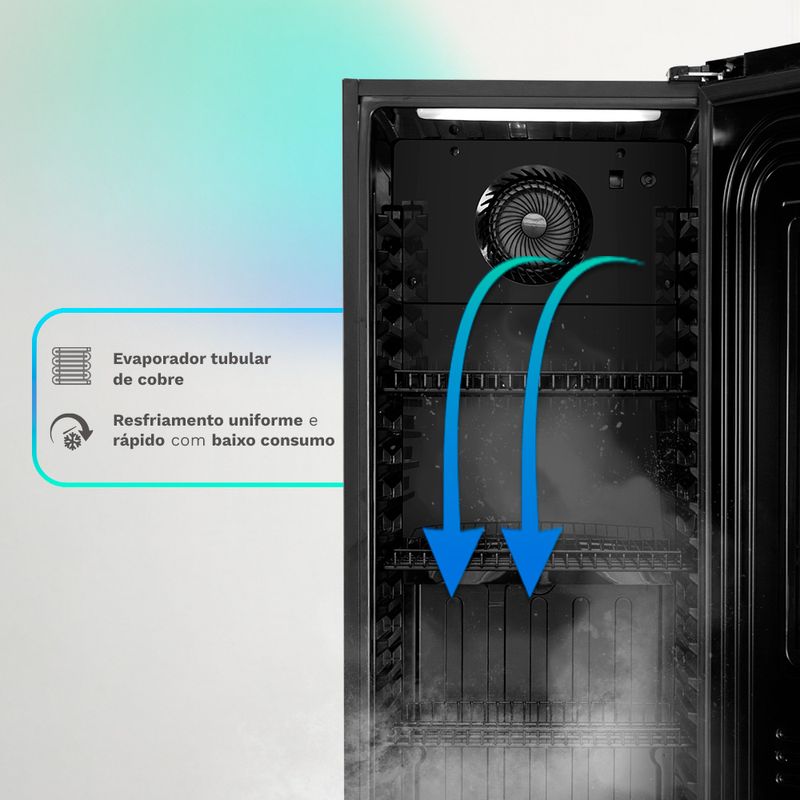 Sistema com evaporador tubular de cobre, ventilador do evaporador e novo duto de ar que garante distribuição uniforme do frio — mais eficiência e menor consumo.