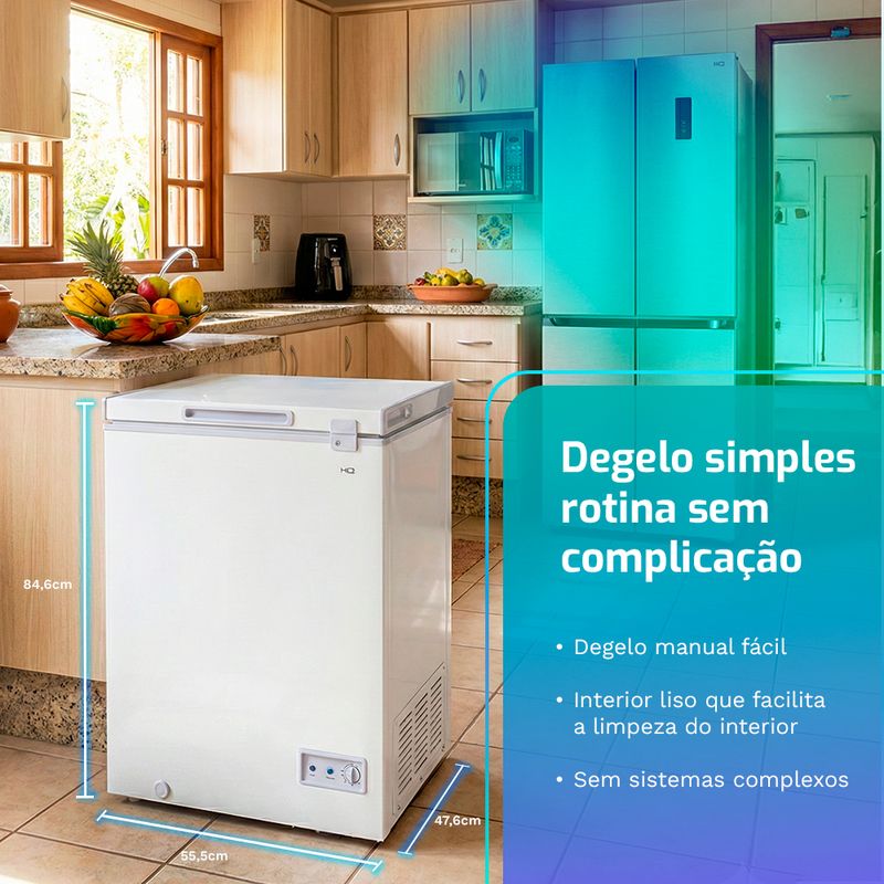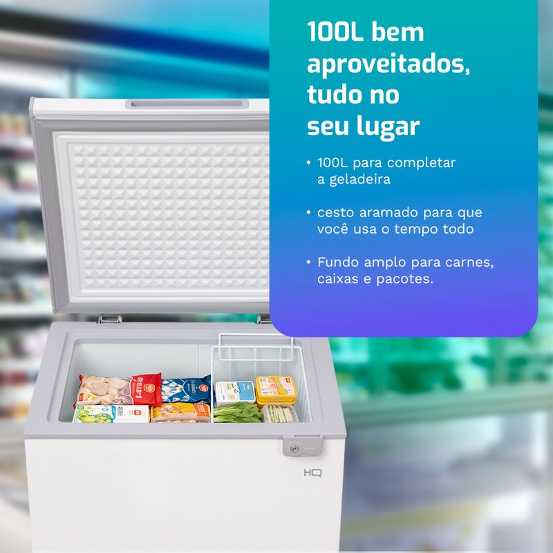 Se o congelador da geladeira vive lotado, o Freezer Horizontal HQ 100L HQ-100CFX é o reforço compacto que faltava. São 100 litros de capacidade em um gabinete pequeno, com consumo em torno de 16,12 kWh/mês.