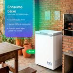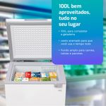Com 100 litros você consegue tirar da geladeira tudo aquilo que ocupa espaço e precisa ficar bem congelado: carnes fracionadas, marmitas, caixas de sorvete, gelo, pães e pré preparos. Para quem faz compra do mês ou gosta de cozinhar em quantidade, é a reserva de frio que libera a geladeira para o uso do dia a dia.
