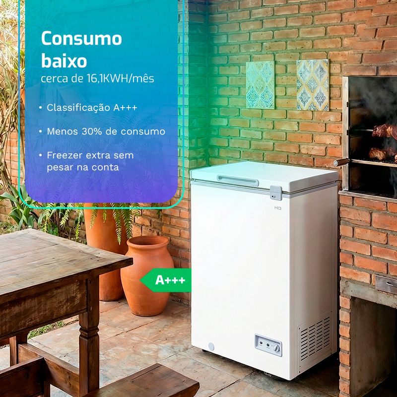 O Freezer HQ-100CFX se destaca na categoria compacta com consumo aproximado de 16,12kWh/mês, isso significa custo fixo reduzido para quem mantém o freezer ligado o ano todo, seja em casa ou como apoio em um pequeno negócio.