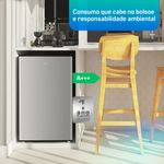 - Organização interna: prateleira removível, nichos na porta, puxador embutido; pés frontais ajustáveis; sala de refrigeração (5 L).
