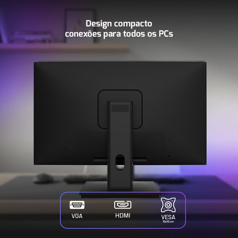 Na conectividade, o monitor conta com HDMI 1.4 e VGA, garantindo compatibilidade com desktops, notebooks e outros dispositivos. A compatibilidade com VESA 100 x 100 mm facilita a instalação em suportes articulados ou de parede. A base fixa oferece ajuste de inclinação de 5° a 15°, proporcionando maior conforto ergonômico.