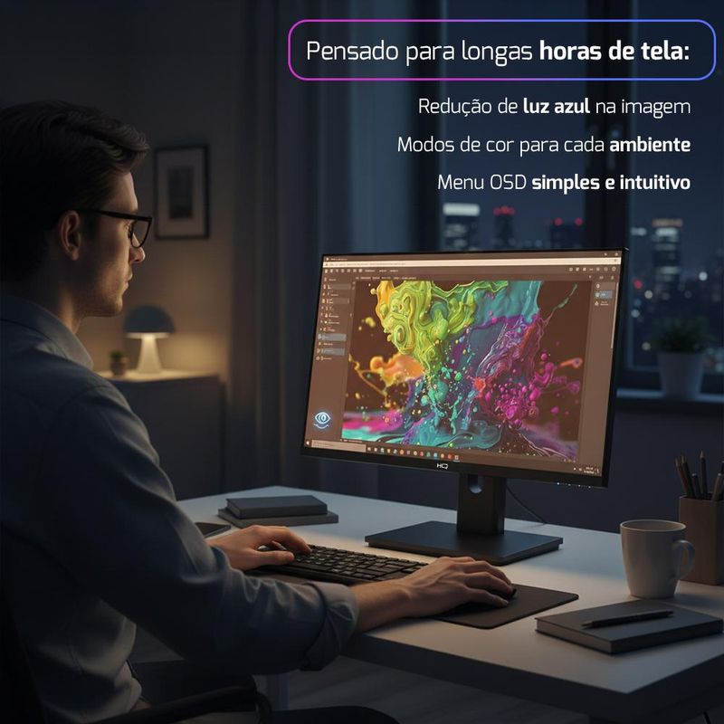 O Monitor HQ 24” foi desenvolvido para oferecer conforto visual, boa fluidez e excelente contraste, sendo ideal para uso diário, estudos, home office, ambientes corporativos e entretenimento. Seu design frameless, com acabamento na cor preta, proporciona um visual moderno e elegante para qualquer setup.