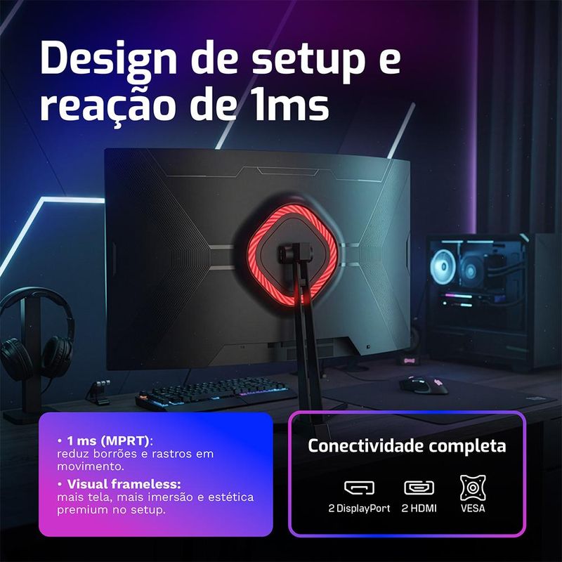 O design é moderno, curvo e funcional. Com ajuste de inclinação de 5° a 15°, você joga com mais conforto. A compatibilidade VESA 75x75mm permite instalação em suportes ou braços articulados, otimizando o espaço do seu setup.