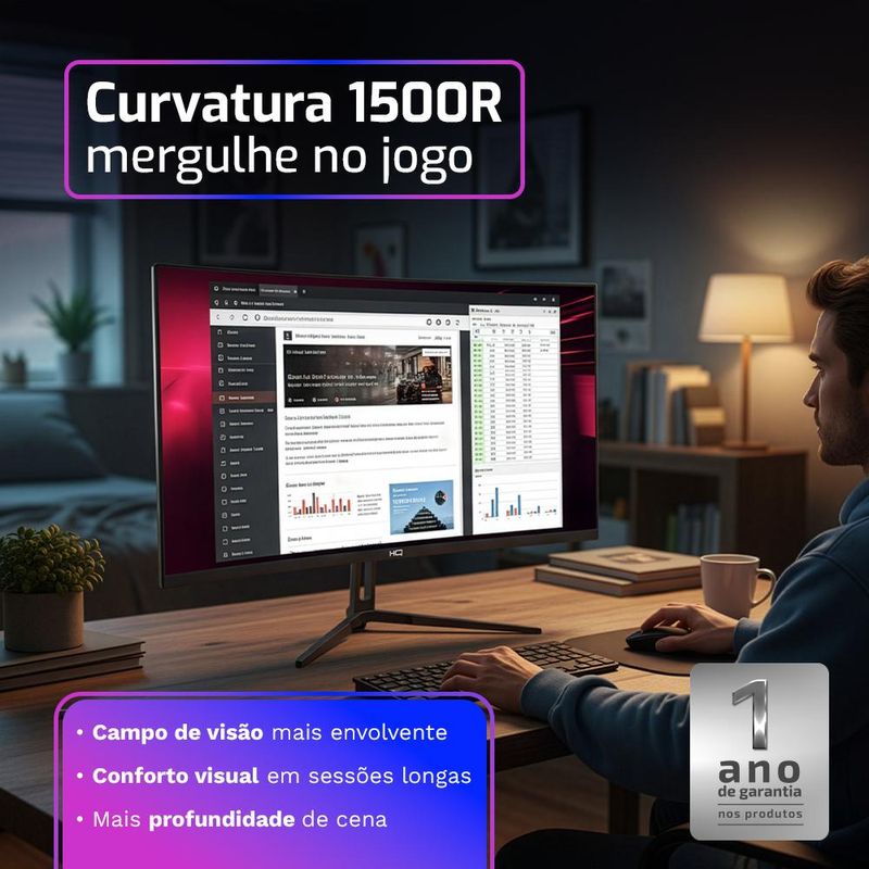 Prepare-se para a verdadeira imersão com o Monitor Gamer LED Curvo HQ 32”. Com proporção ultrawide 16:9, ele oferece uma visão ampla, perfeita para games, filmes e produtividade.
